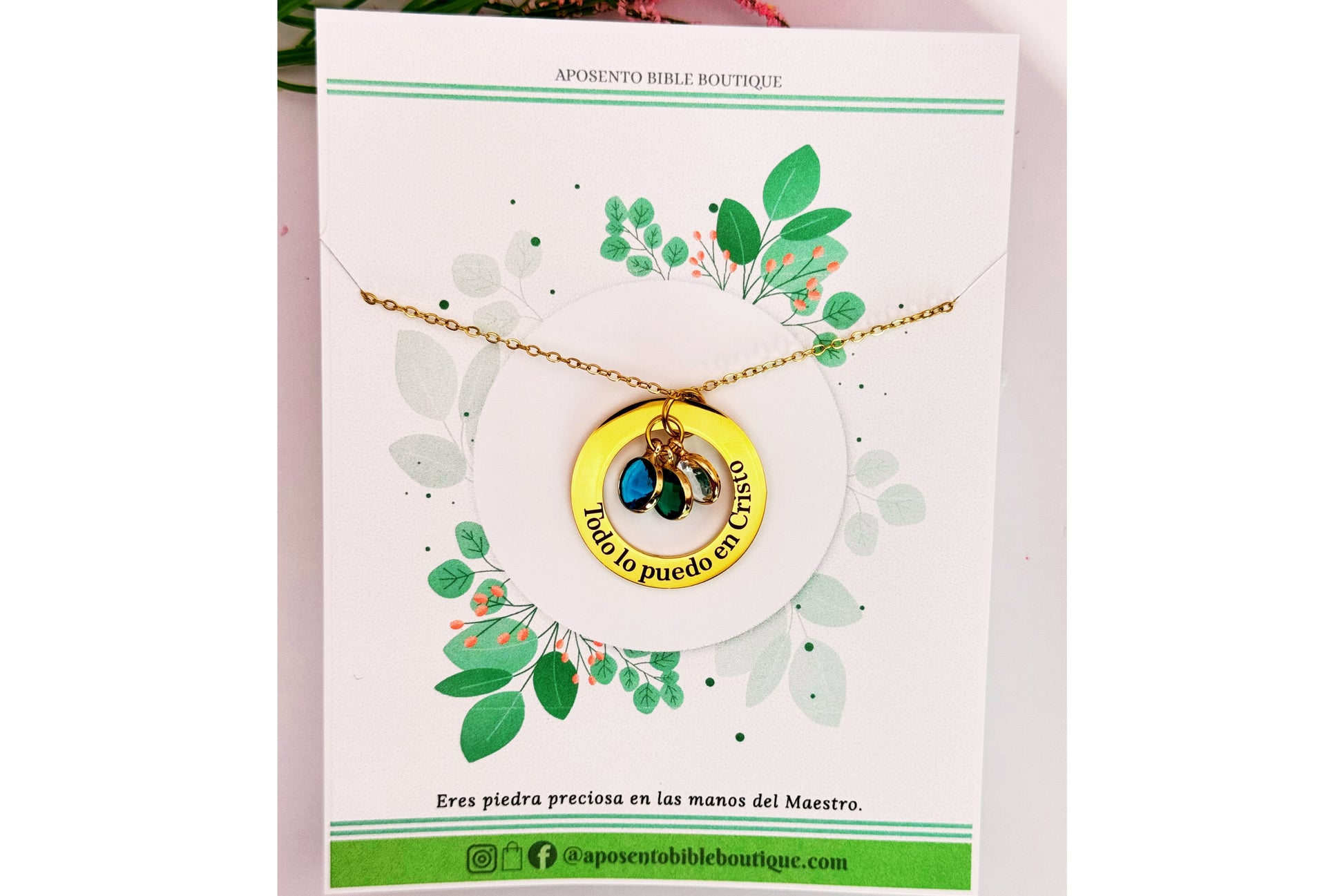 Este poderoso collar combina el diseño elegante de tres piedras verdes con una de las frases más impactantes de fe: “Todo lo puedo en Cristo”. Una declaración para quienes caminan en confianza, fuerza y propósito.